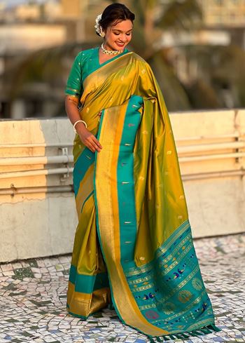 Woven Gold Jari Peacock Designer Mahendi Paithani Silk Ethnic Saree