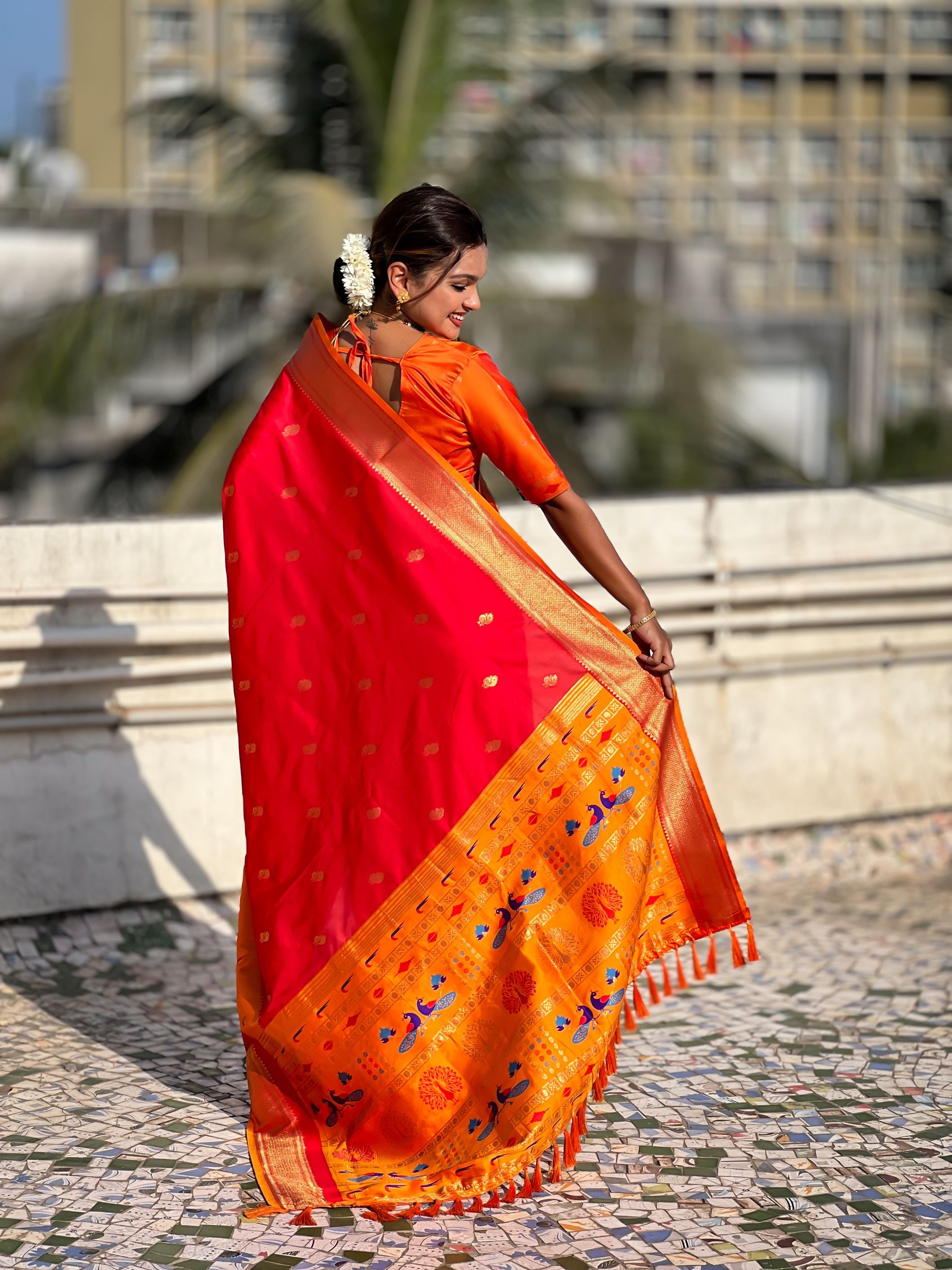 The vibrant red color symbolizes grace and power, while the golden zari work enhances its opulent charm. The highlight of this saree is its Paithani-inspired pallu, adorned with traditional motifs and intricate weaving that make it a true masterpiece of craftsmanship.