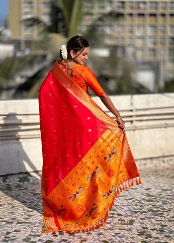 Woven Gold Jari Peacock Designer Red Paithani Silk Ethnic Saree
