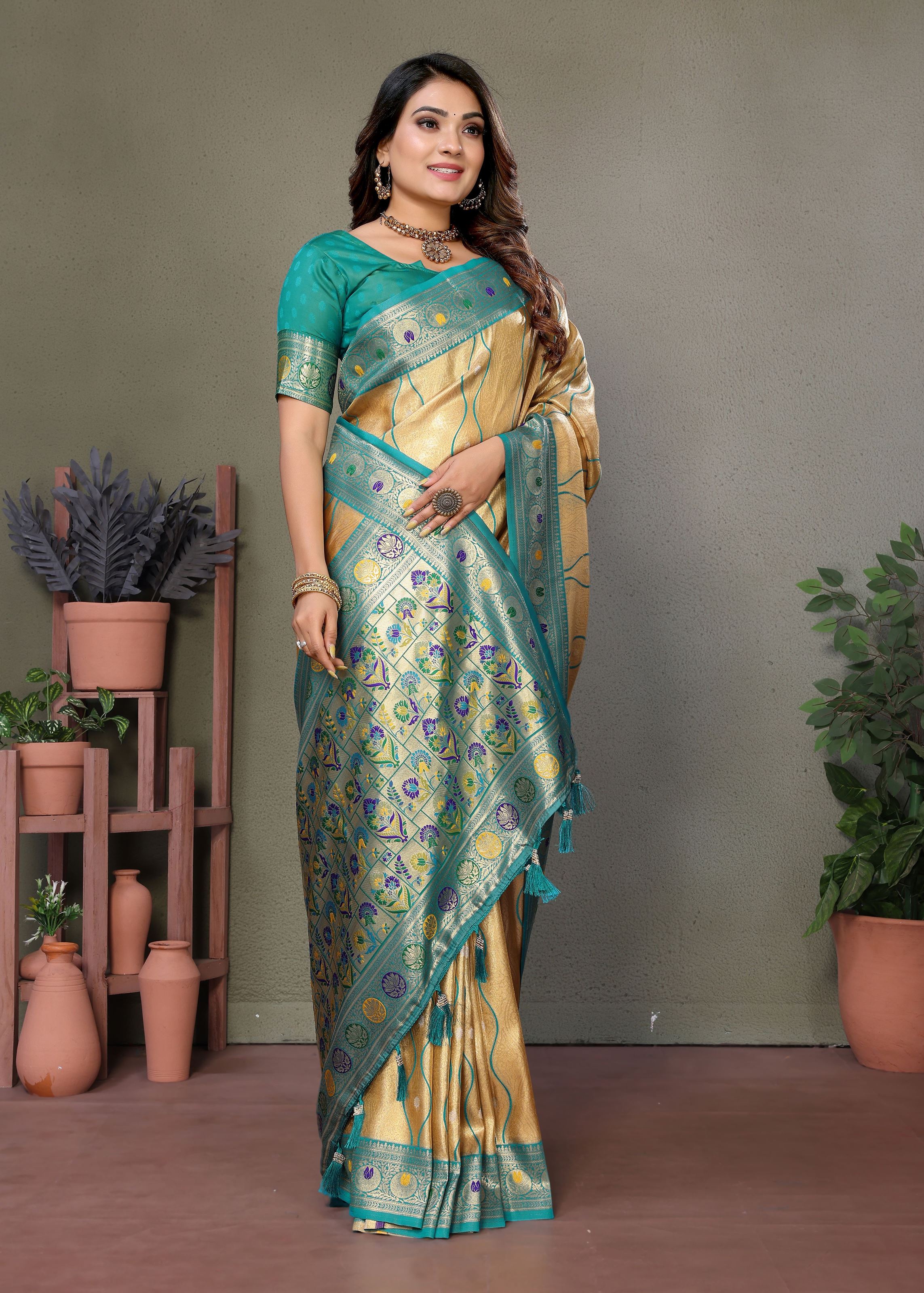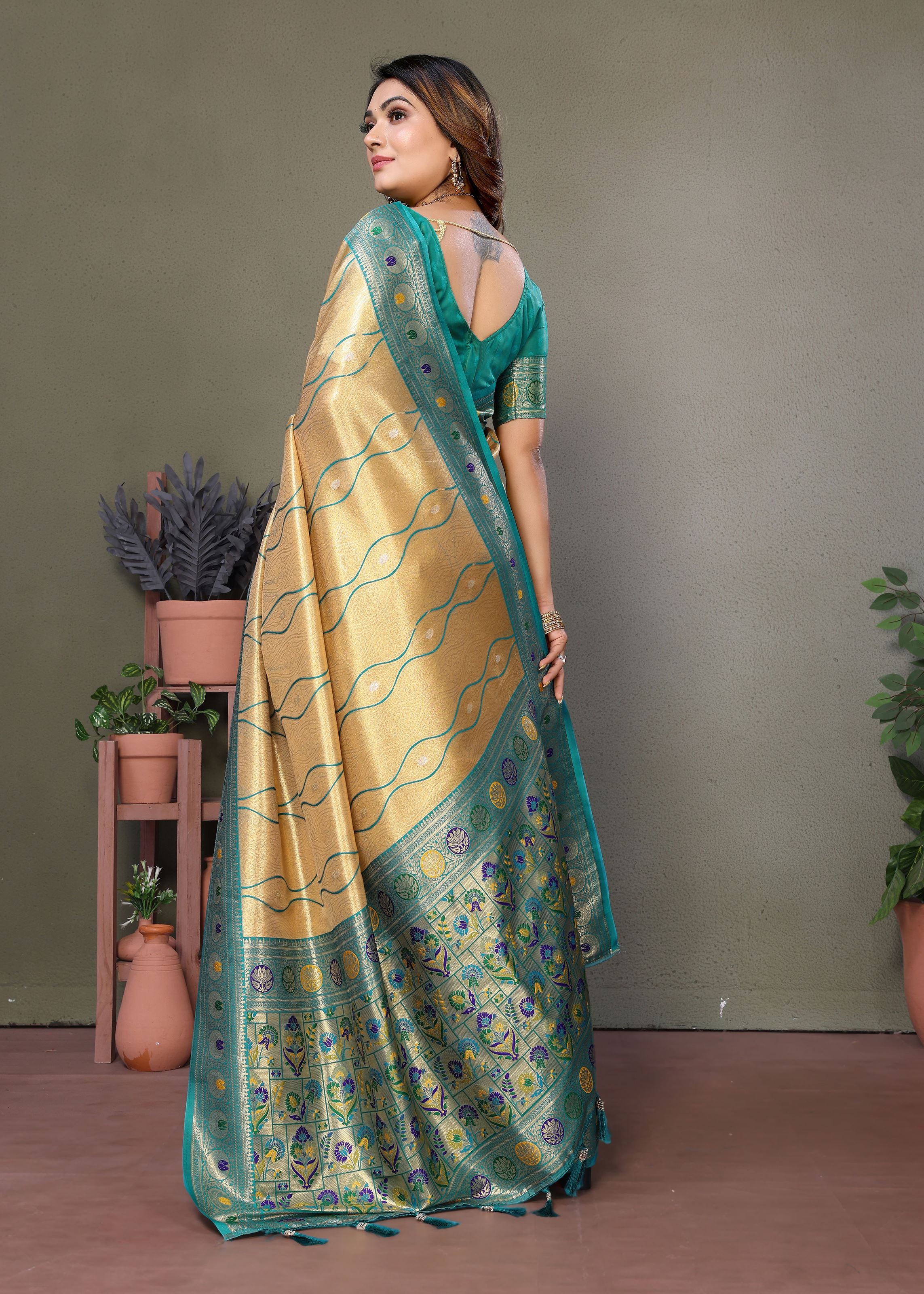 The subtle beige body is beautifully paired with a contrasting teal silk blend blouse, creating a visually striking and regal combination. Ideal for weddings, festive gatherings, and special celebrations, this designer saree is perfect for women who appreciate classic tradition blended with contemporary elegance.