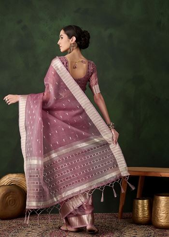 The saree is beautifully highlighted with woven jacquard patterns, showcasing timeless craftsmanship and intricate artistry. Its lightweight nature ensures effortless draping, while the subtle sheen of organza adds an enchanting glow to your festive look. Paired with a matching mauve organza blouse, the ensemble creates a harmonious balance of tradition and style. For a bold designer appeal, it can also be paired with a contrasting blouse and statement jewelry.