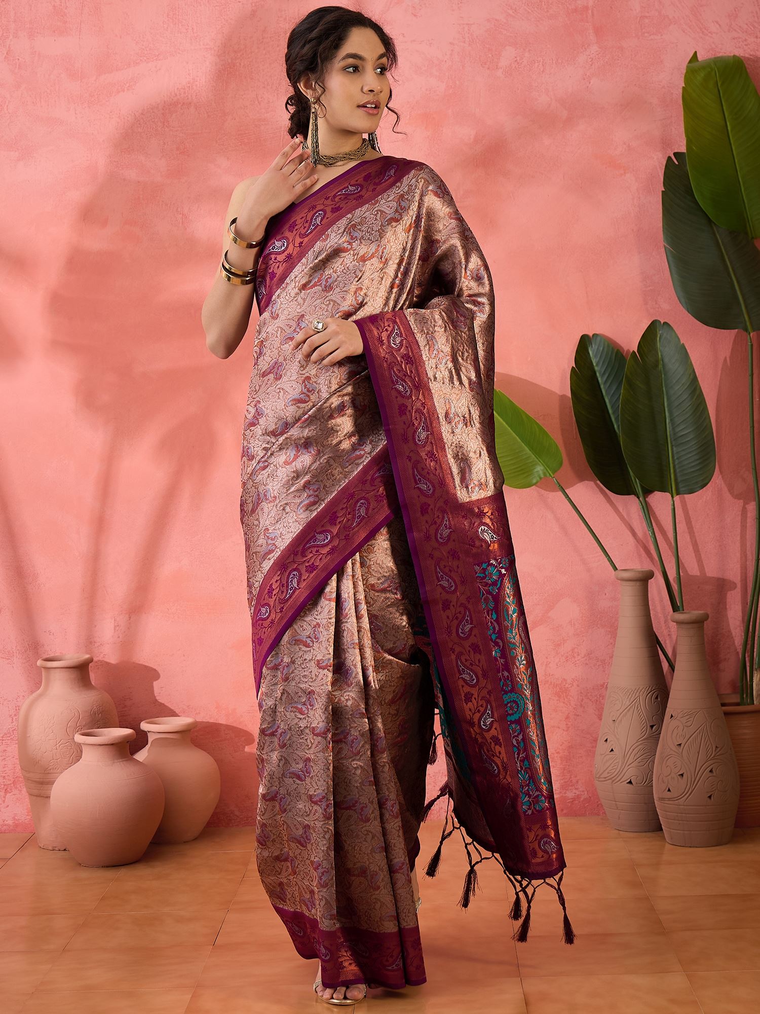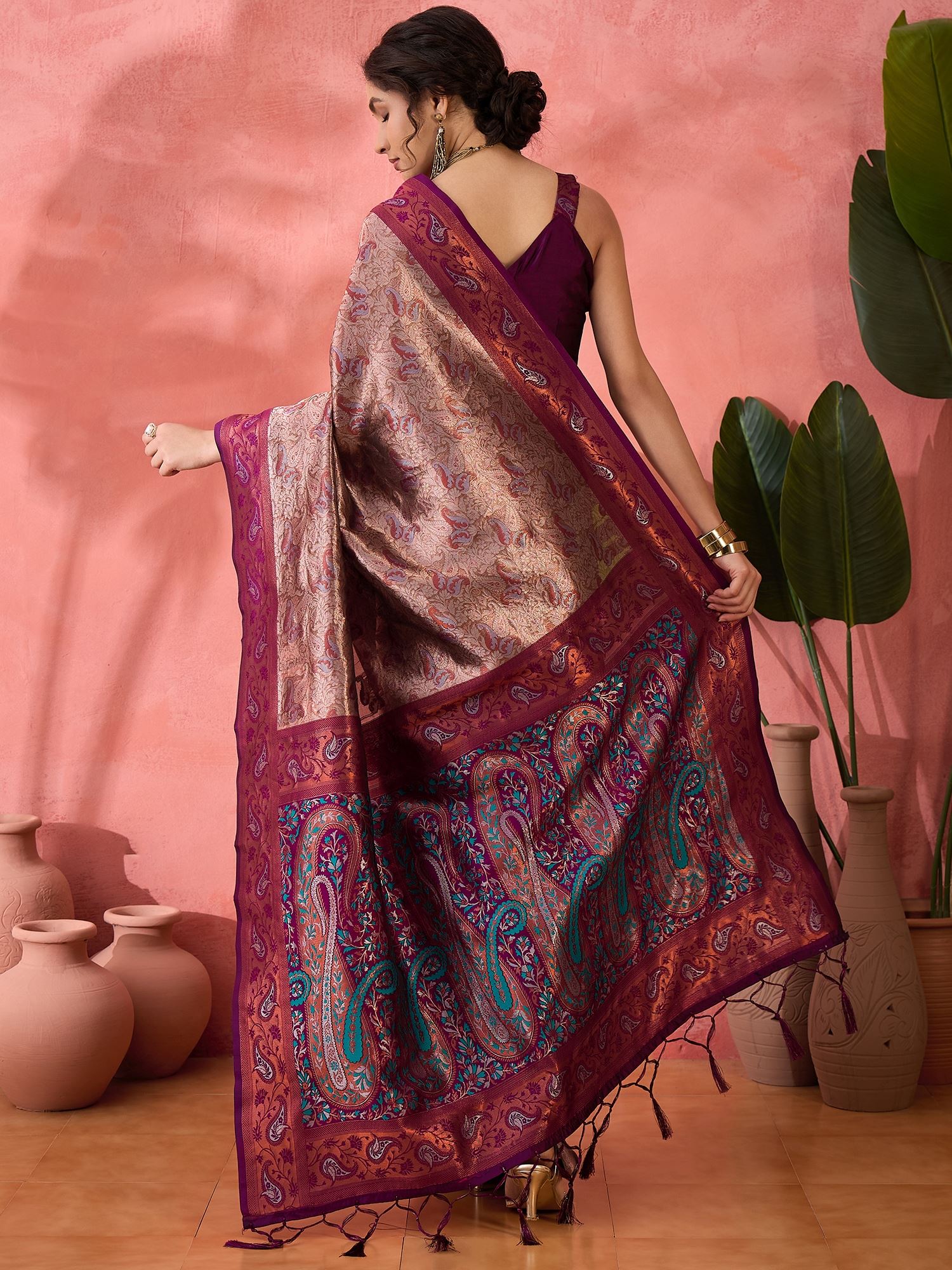 Woven Jacquard Designer Silk Blended Ethnic Partywear Ceremonial Wine Saree