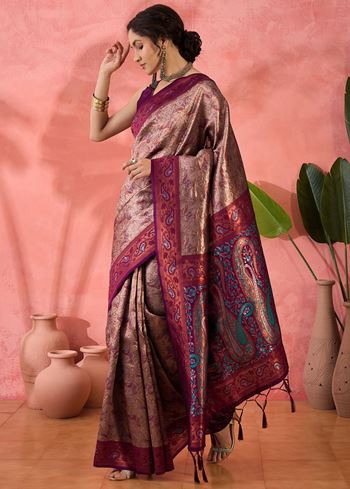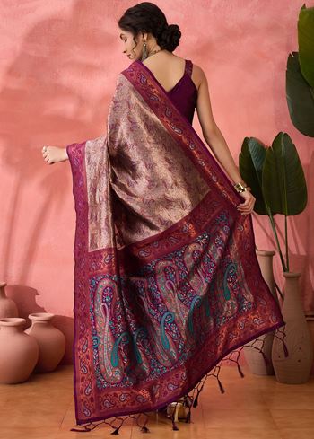 The saree comes paired with a matching wine silk blend blouse, ensuring a coordinated and stylish look. Its soft, smooth texture and elegant drape make it comfortable for all-day wear while enhancing your feminine grace. The woven detailing adds depth and richness, making this saree an exquisite piece for your wardrobe.