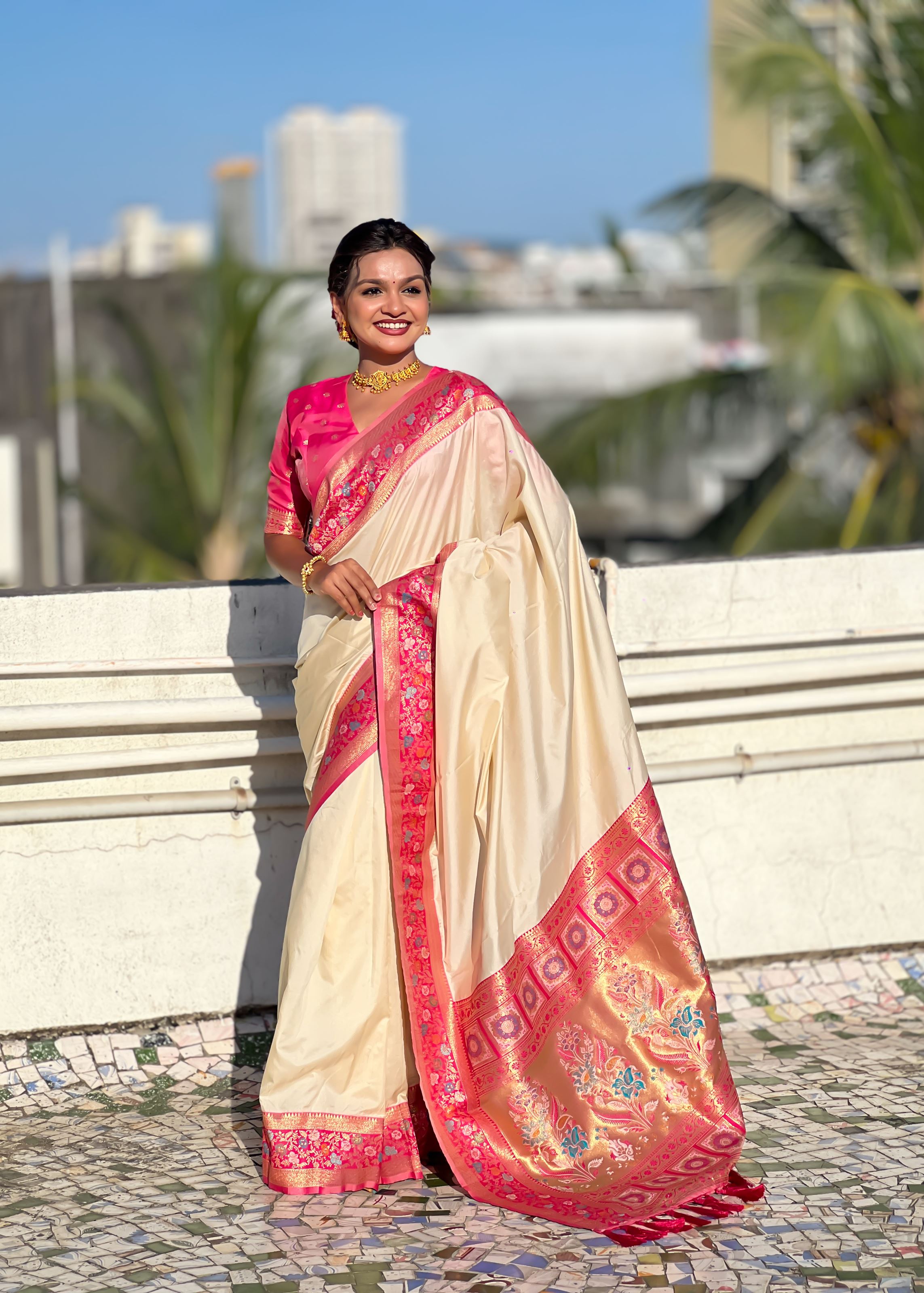 Woven Kadiyal Paithani Gala Designer Cream Soft Silk Ethnic Saree