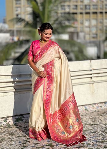 Accompanying the saree is a contrasting pink silk blend blouse piece, allowing you to create a stylish look that complements the overall design. Pair it with gold jewelry, statement earrings, and embellished sandals to complete your regal ensemble.Perfect for bridesmaids, festive occasions, or cultural events, this cream Paithani silk saree is a versatile choice that adds a royal touch to any celebration. Its elegant color combination, traditional design, and premium quality make it a must-have for every saree lover.