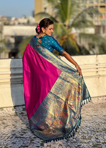 Complementing this stunning saree is a teal silk blend blouse piece, offering a striking contrast that enhances its beauty. Pair it with statement jewelry, a traditional bun, and embellished heels for a royal look that turns heads at weddings, receptions, or festive gatherings.Celebrate tradition in style with this magenta Paithani silk saree, designed for women who appreciate elegance and authenticity. Its luxurious feel, classic color combination, and exquisite weaving make it the perfect attire for any grand celebration.