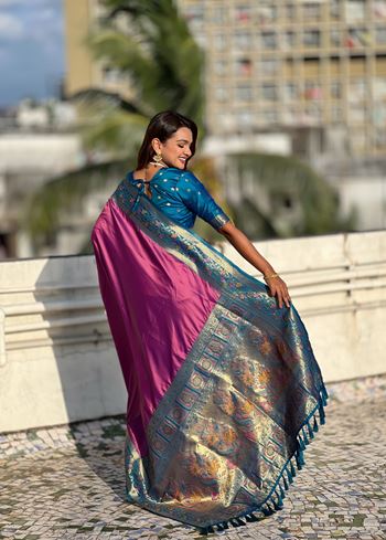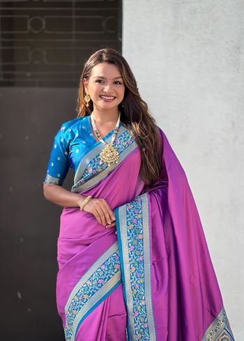 Complementing the saree is a striking blue silk blend blouse piece, adding a bold contrast to the rich purple base. The detailed woven patterns on the pallu and borders enhance its regal charm, making it ideal for weddings, receptions, cultural functions, and festive gatherings.Pair this saree with statement jewelry like traditional gold necklaces or elegant kundan sets to complete the royal look. If you desire to make a graceful and impactful statement, this Purple Woven Paithani Silk Saree is your ultimate choice.