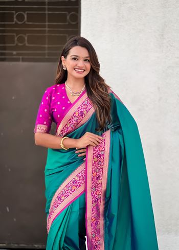 Complementing this saree is a contrasting pink blouse piece crafted from the same silk blend fabric, offering versatility for creating stylish looks. Pair it with traditional jewelry such as chandbalis, temple necklaces, and bangles to elevate your festive ensemble.Whether you’re attending a wedding, hosting a family event, or celebrating a festival, this Sea Green Paithani Silk Saree promises to make you the center of attention. Its rich colors, delicate patterns, and fine craftsmanship speak volumes about your impeccable taste in ethnic fashion.