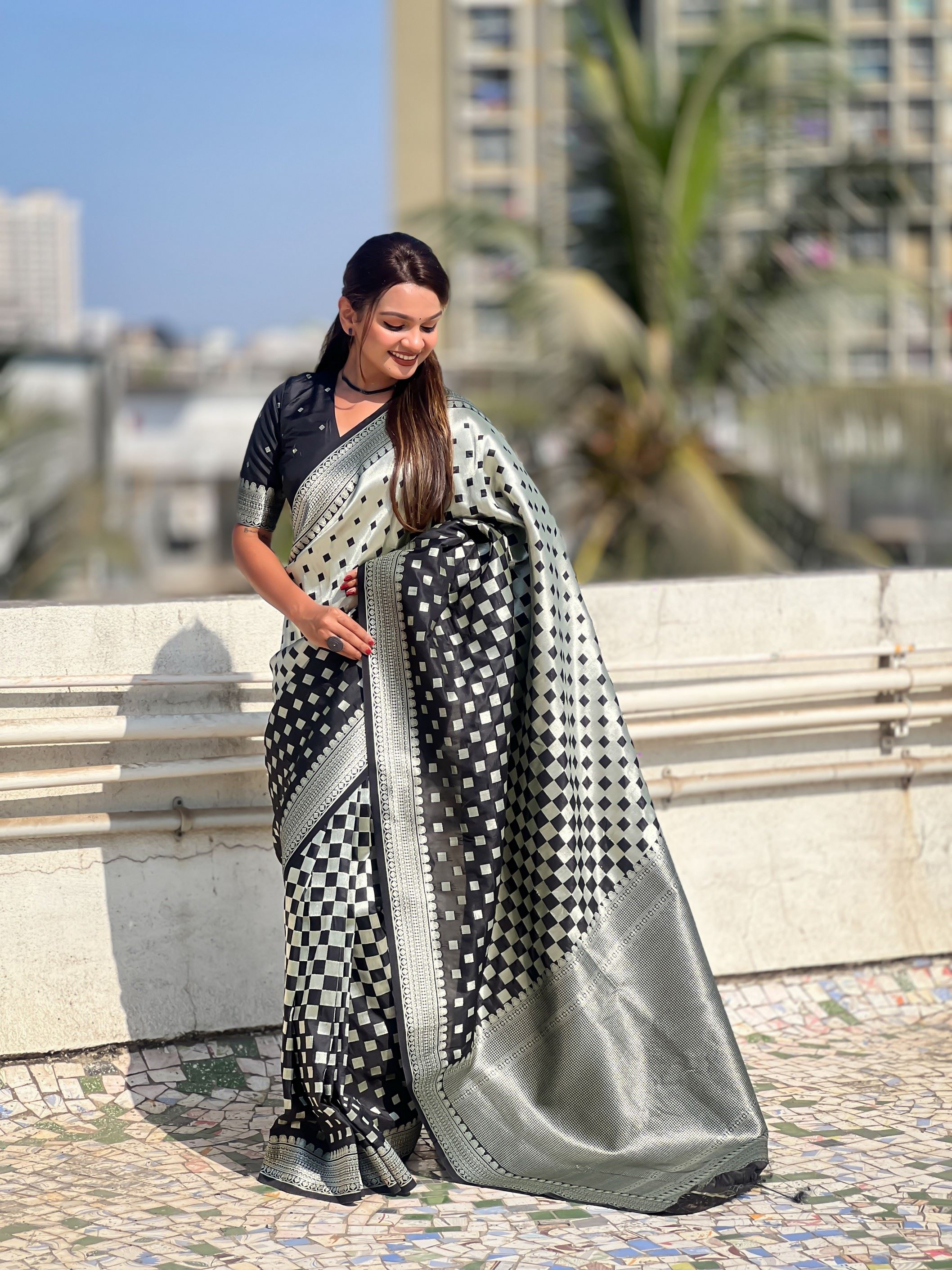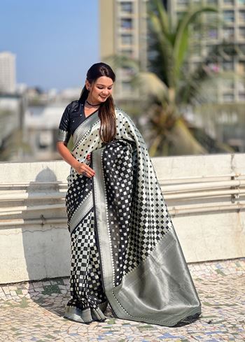 Woven Silver Jari Checks Designer Banarasi Silk Black Beautiful Saree