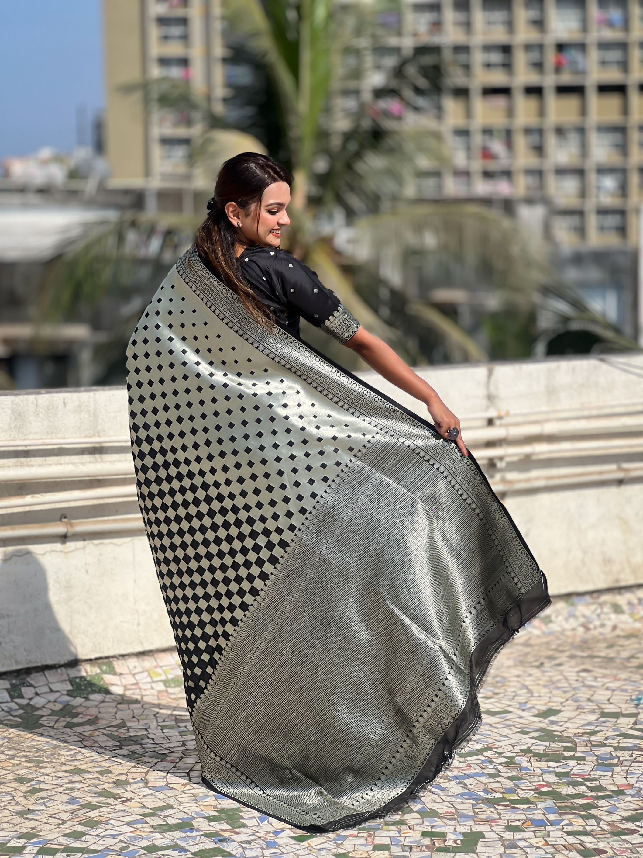 Woven Silver Jari Checks Designer Banarasi Silk Black Saree