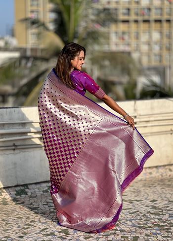 The rich purple color paired with delicate silver jari woven checks creates a sophisticated and regal look. Inspired by the traditional Banarasi weaving technique, the intricate patterns add depth and elegance, making this saree an ideal choice for women who appreciate fine artistry. Whether for receptions, parties, or festive gatherings, this piece promises a statement-making presence.