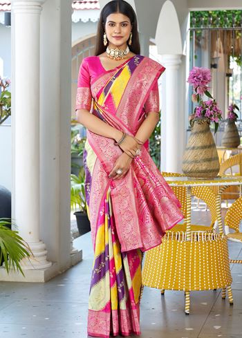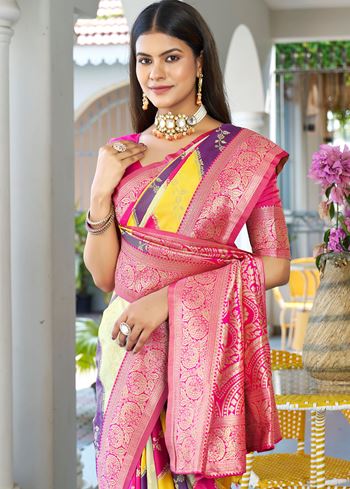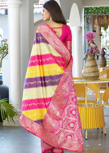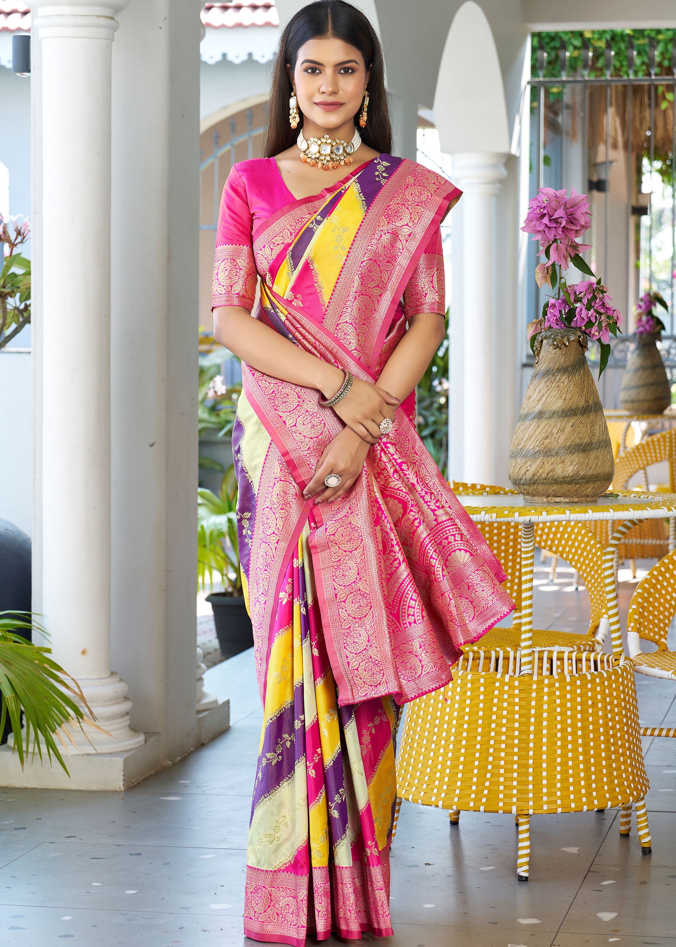 Woven in lustrous Banarasi silk, this saree features a bright yellow base that radiates positivity and celebration. Intricately patterned Leriya-style zari weaves flow across the drape, adding a rhythmic touch of heritage-inspired detail. The rich contrast pallu in pink brings a striking pop of colour, perfectly balanced by a matching pink Banarasi silk blouse for a harmonious and graceful look.