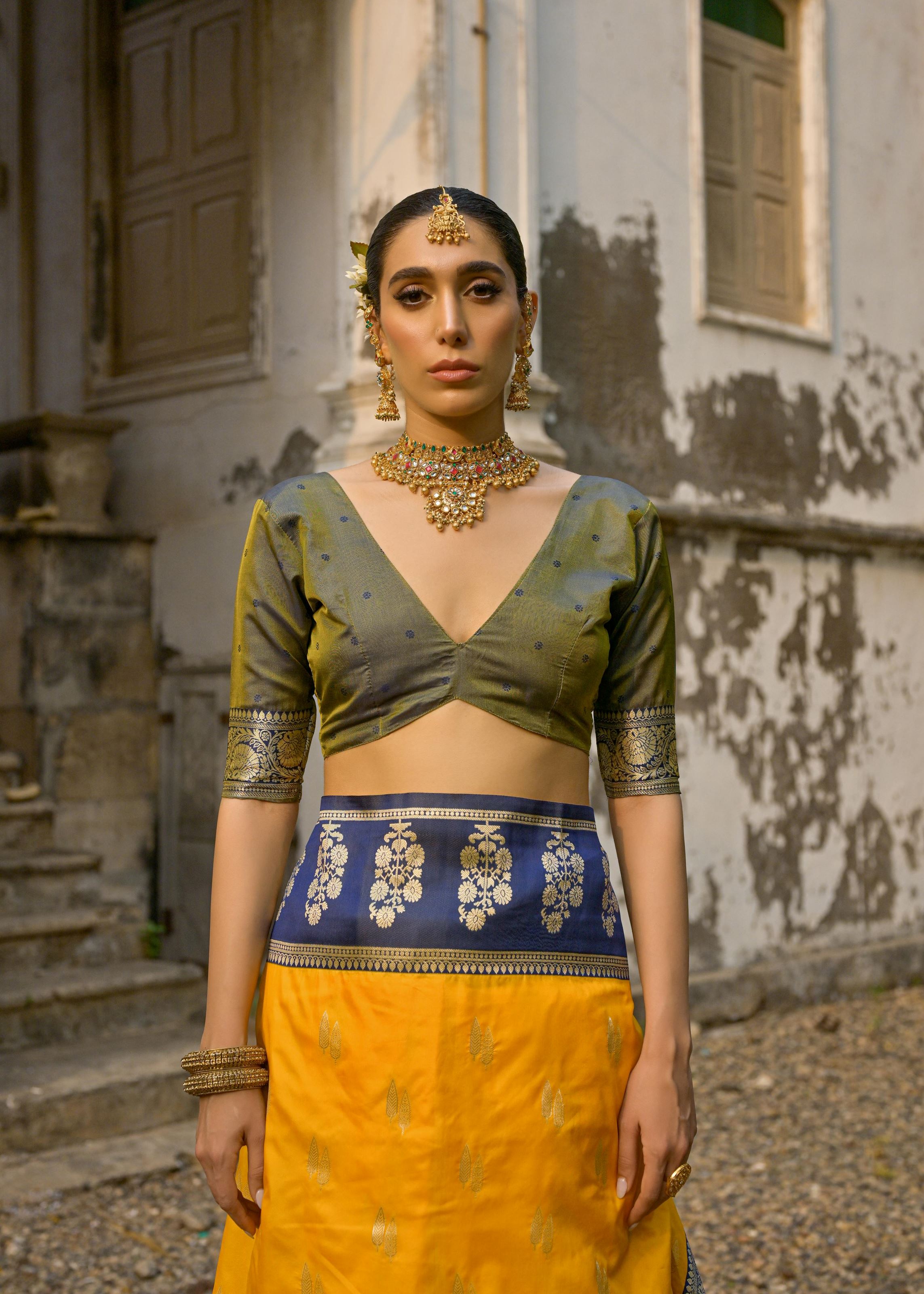 Radiate timeless charm with the Yellow Banarasi Silk Woven Jari Saree, a regal creation crafted to celebrate tradition and luxury. Made from a rich silk blend fabric, this saree brings together the grandeur of Banarasi weaving with the brilliance of zari craftsmanship, making it a perfect choice for weddings, receptions, and grand festivities.
