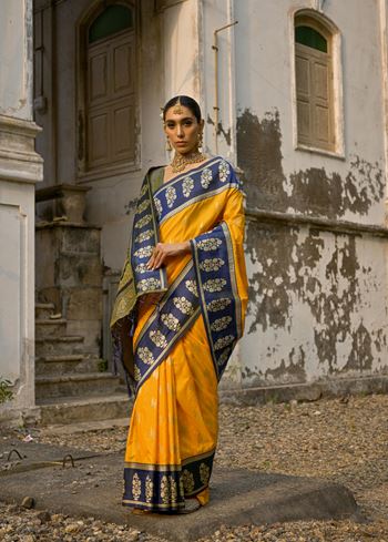 The vibrant yellow hue symbolizes prosperity and joy, making it especially fitting for auspicious occasions. Adorned with delicate woven zari patterns, the saree exudes a majestic aura that reflects the essence of ceremonial wear. Its exquisite craftsmanship ensures that every drape speaks of heritage, elegance, and grace.