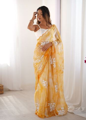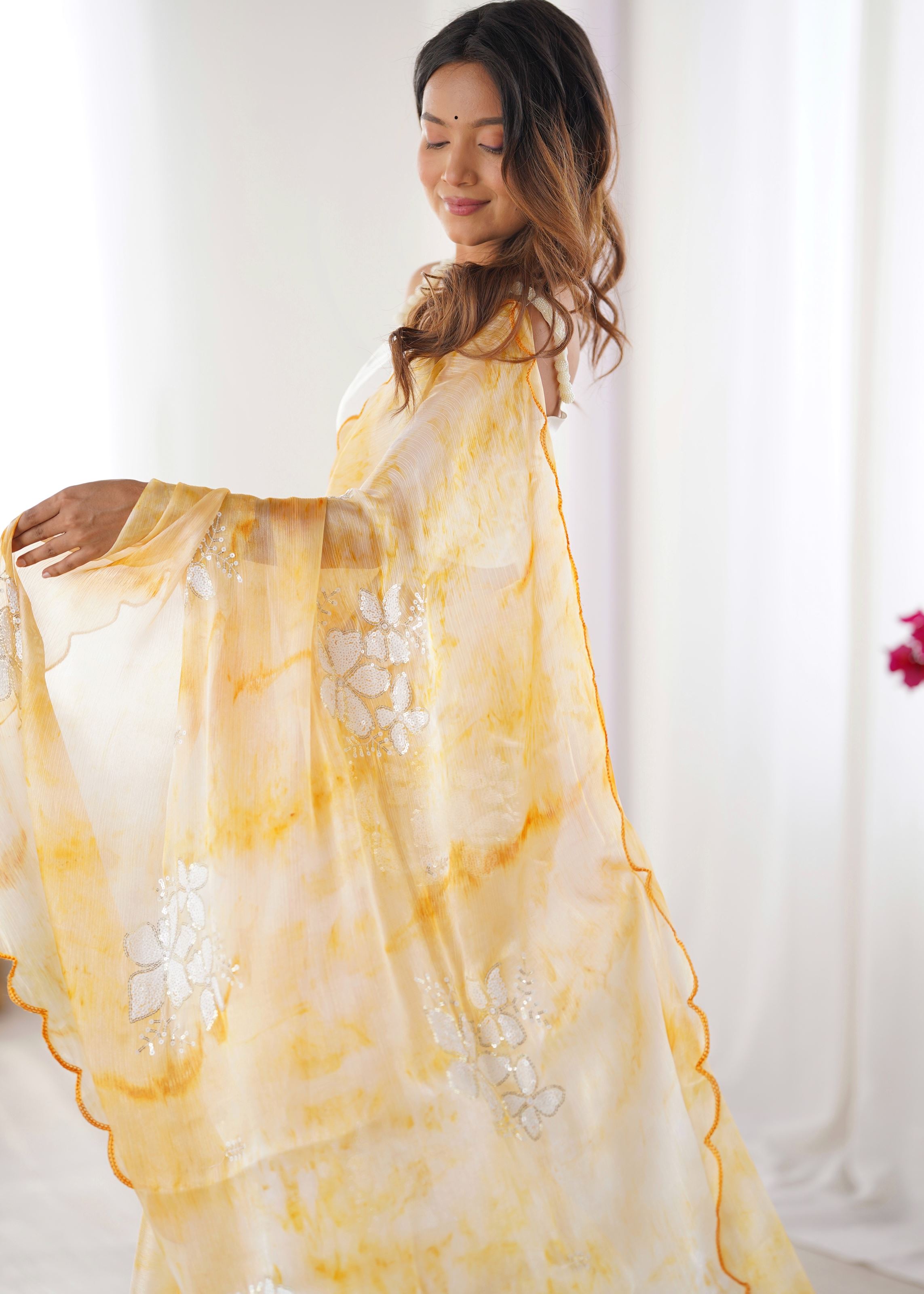 Crafted from premium chiffon fabric, this saree ensures a soft, lightweight drape that flows gracefully, keeping you comfortable all day long. The cheerful yellow hue adds a radiant charm, making you stand out in any crowd. The saree features sequins embroidery and printed detailing, striking a balance between simplicity and sophistication.