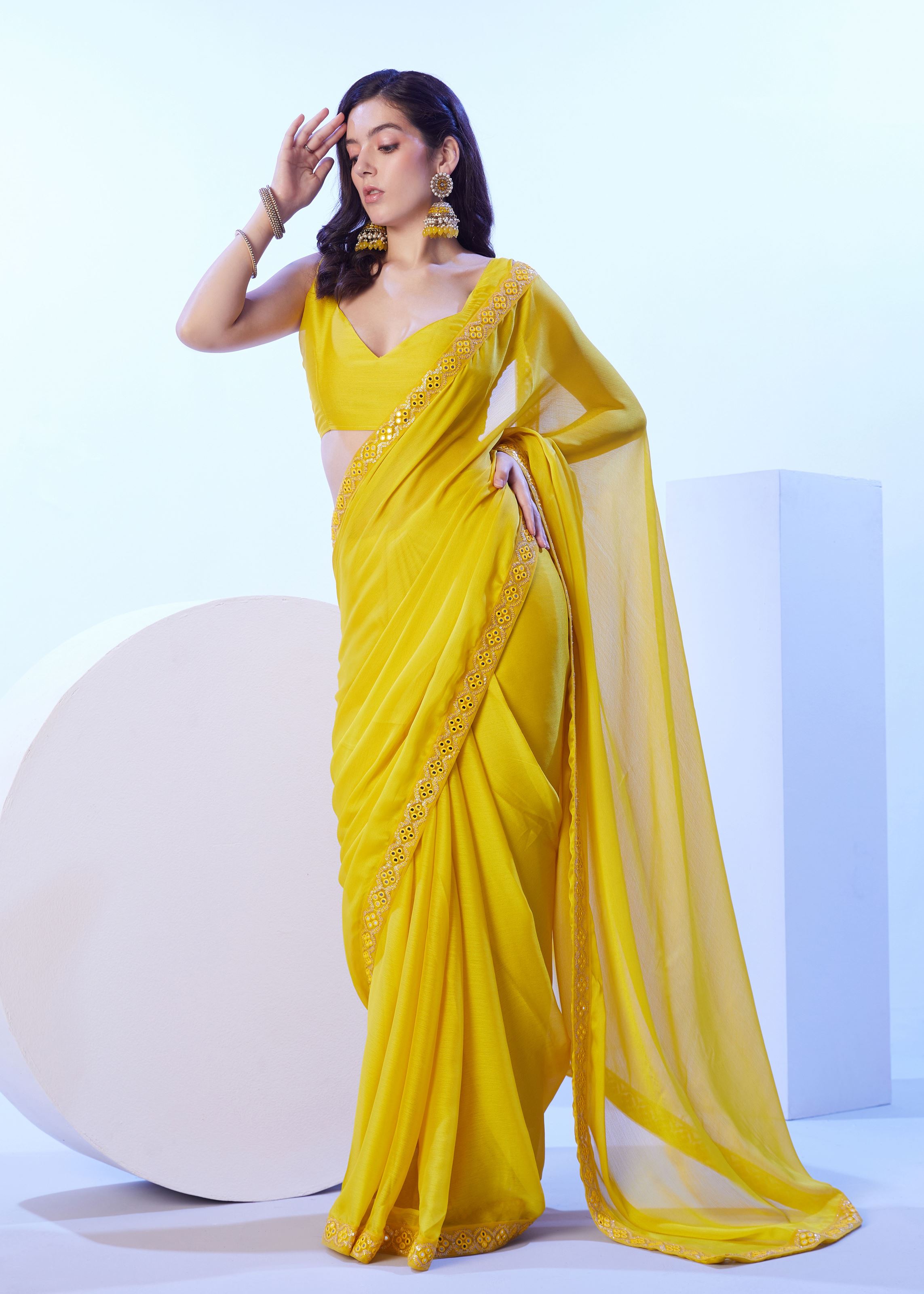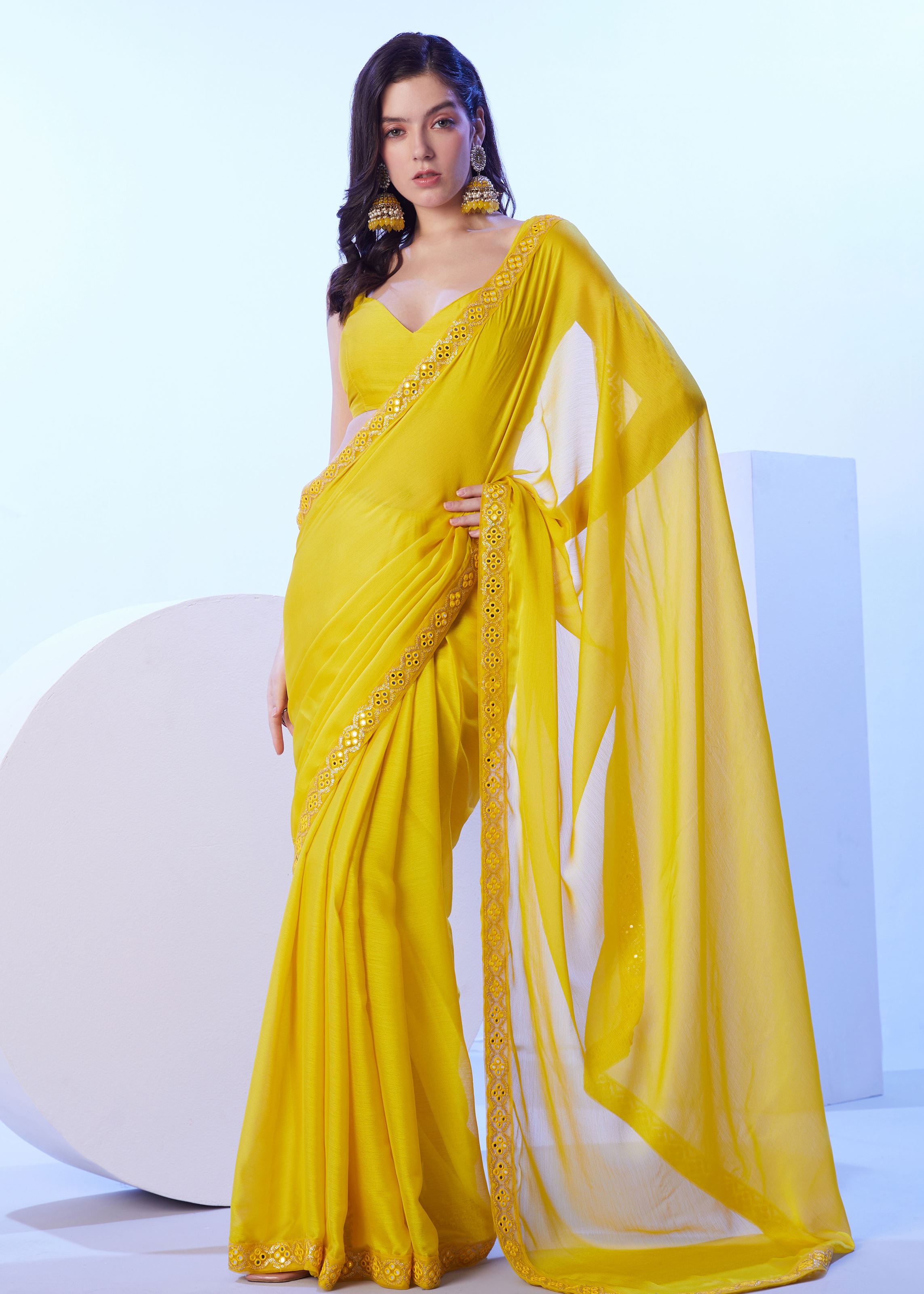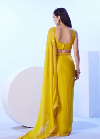 This saree comes with a matching yellow art silk blouse adorned with delicate printed work, enhancing its overall sophistication. Its lightweight texture ensures all-day comfort, while its chic Bollywood-inspired design makes it ideal for wedding functions, festive celebrations, cocktail evenings, or glamorous parties.