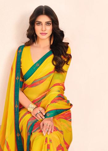 Radiate grace and charm with this Yellow Bemberg Georgette Saree, designed for the modern woman who appreciates tradition with a touch of contemporary elegance. Crafted from luxurious faux georgette, the saree drapes beautifully, offering both comfort and style for long celebrations. Its lightweight texture ensures easy movement while adding a flowy, graceful appeal, making it ideal for weddings, festive gatherings, and cultural ceremonies.