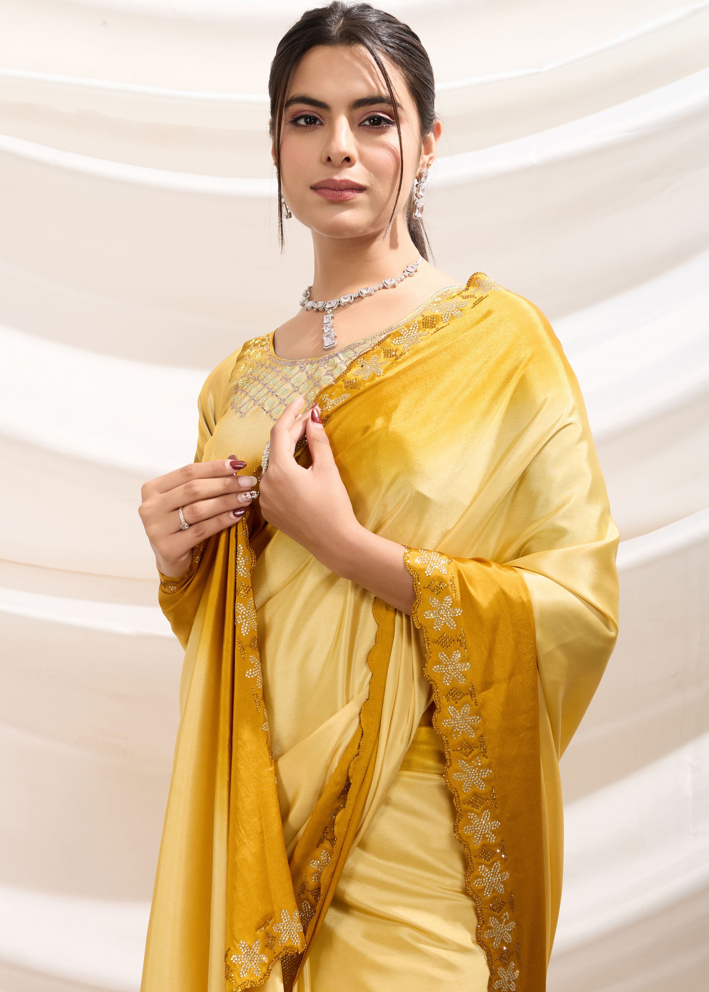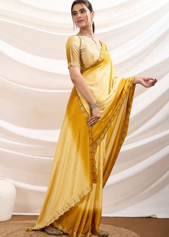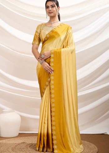 Yellow Color Ombre Dyed Crepe Saree With Dual tone stone Border work