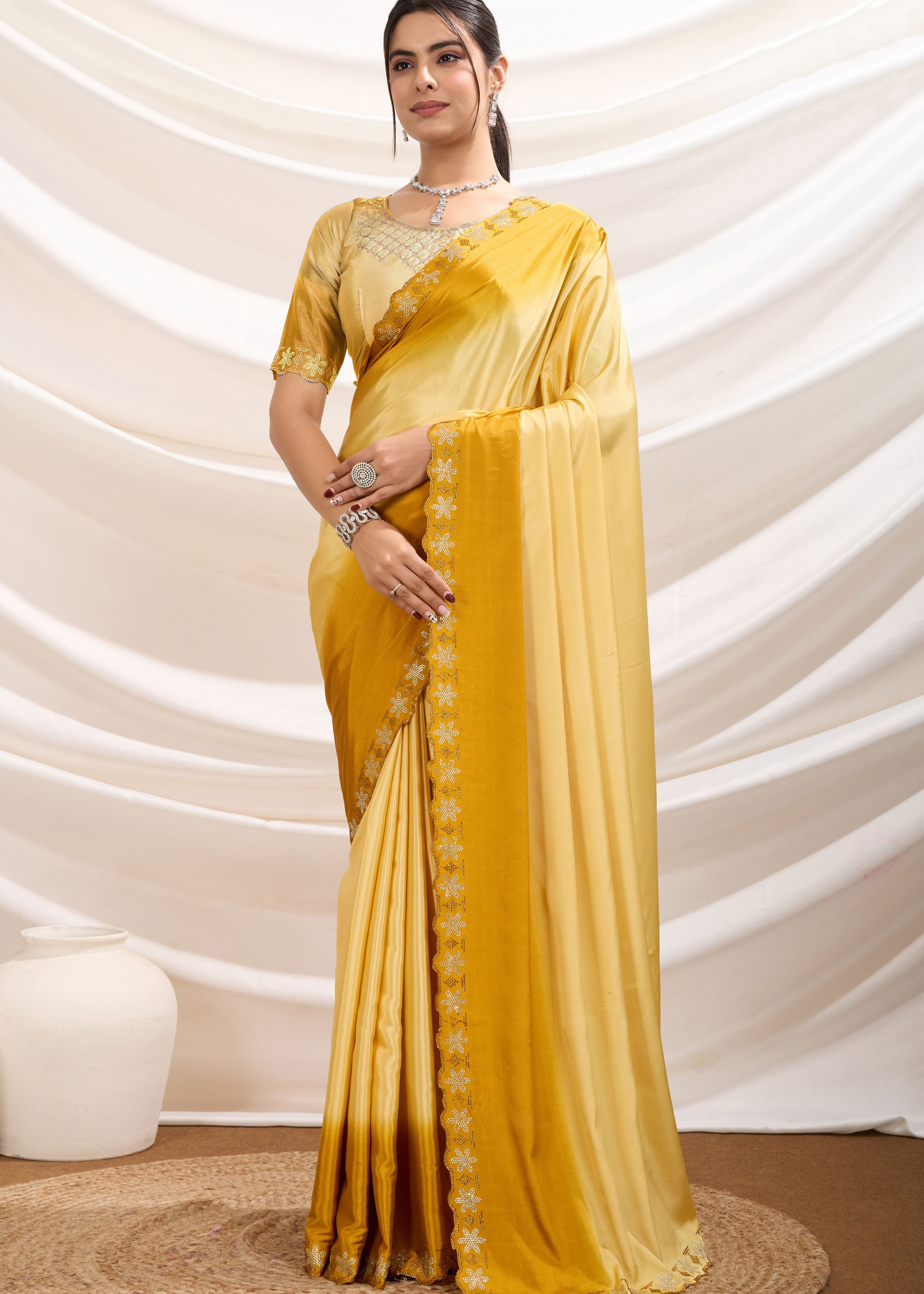 Yellow Color Ombre Dyed Crepe Saree with Dual Tone Stone Border Work