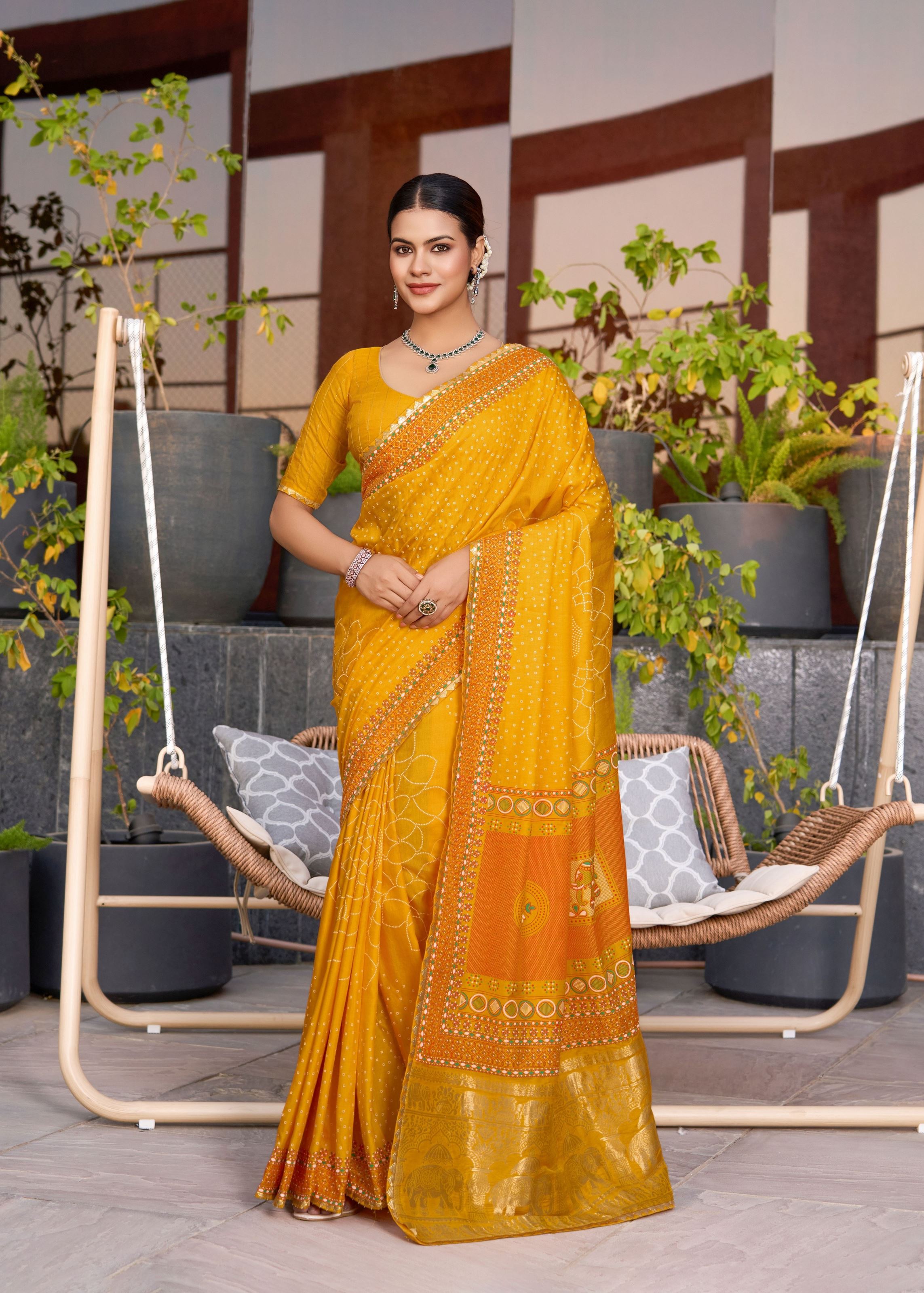 Crafted from premium blended cotton silk fabric, the saree offers a smooth and comfortable drape, making it ideal for long hours of wear. The cheerful yellow hue symbolizes joy and positivity, making it an excellent choice for haldi ceremonies, festive gatherings, and summer celebrations. The intricate woven work, enhanced with table and foil printing, adds a touch of richness and sophistication to the overall look.