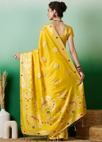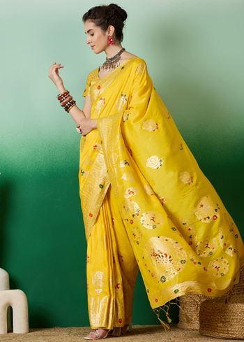 The vibrant yellow color symbolizes positivity, joy, and festivity, making it an ideal choice for weddings, pujas, and cultural celebrations. The saree is adorned with intricate Meenakari woven designs, showcasing the richness of traditional Indian craftsmanship and adding a regal touch to your look.