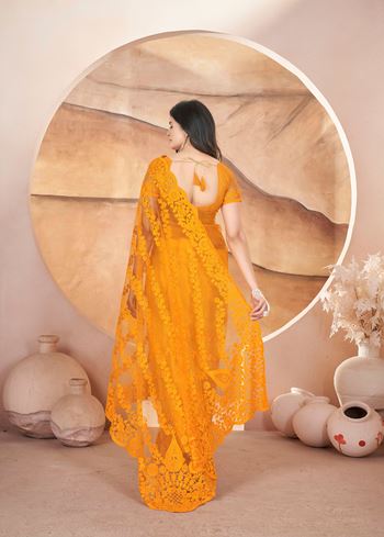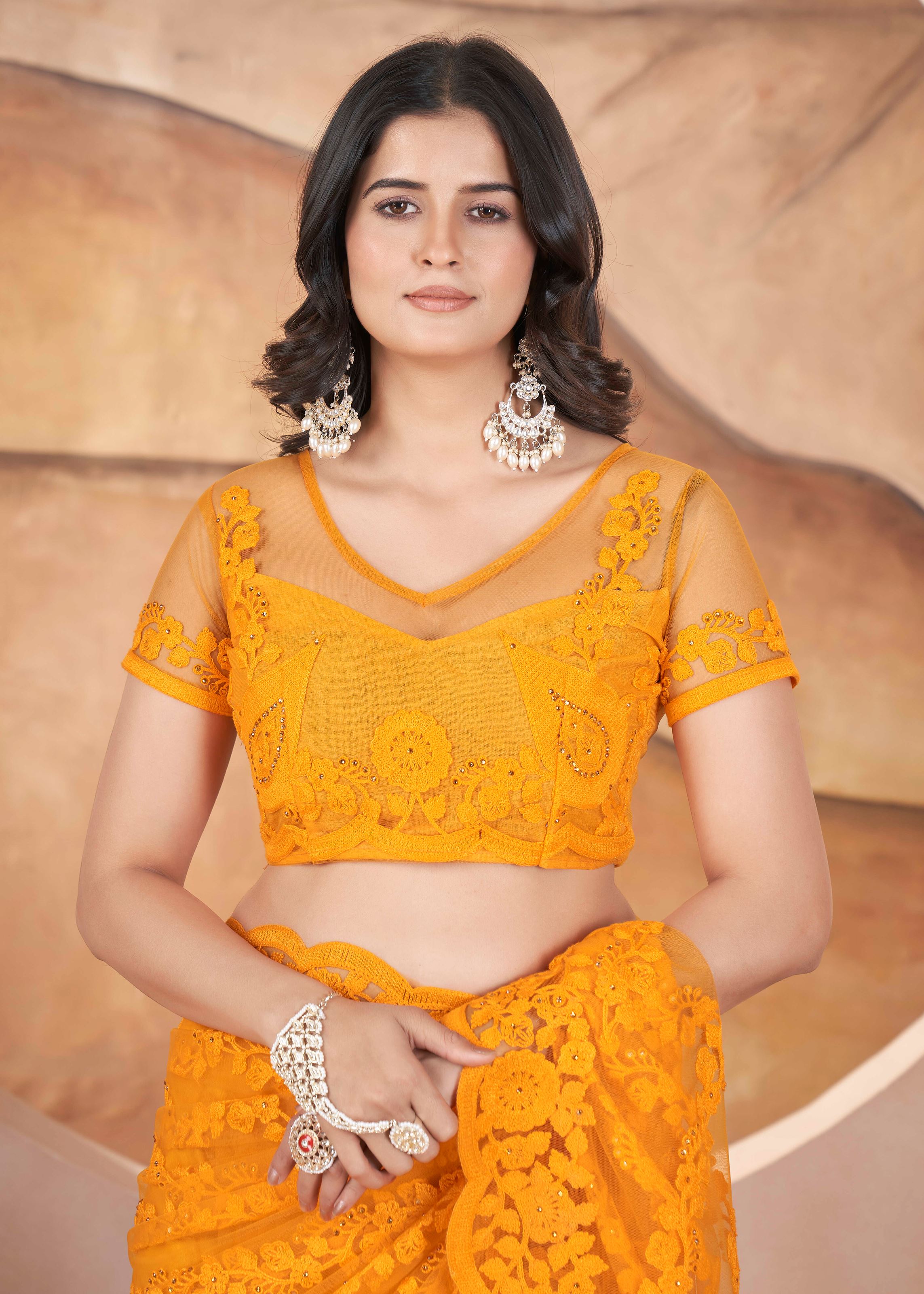 The saree is paired with a matching yellow net blouse, ensuring a perfectly coordinated and chic look. The intricate embroidery details and delicate stone embellishments reflect the finest craftsmanship, giving you a royal and glamorous appeal. This piece is ideal for bridesmaids, Haldi ceremonies, or anyone looking for that perfect traditional yet trendy ensemble.