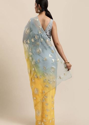 The bright yellow base is beautifully complemented by a contrasting grey silk blend blouse, creating a stylish and elegant ensemble. Its lightweight and breathable fabric drapes gracefully, highlighting the intricate Gota Patti patterns while ensuring comfort and a flattering fit. Designed for women who appreciate authentic artistry and feminine elegance, this designer saree makes a striking statement at bridal functions, festive gatherings, and special celebrations.