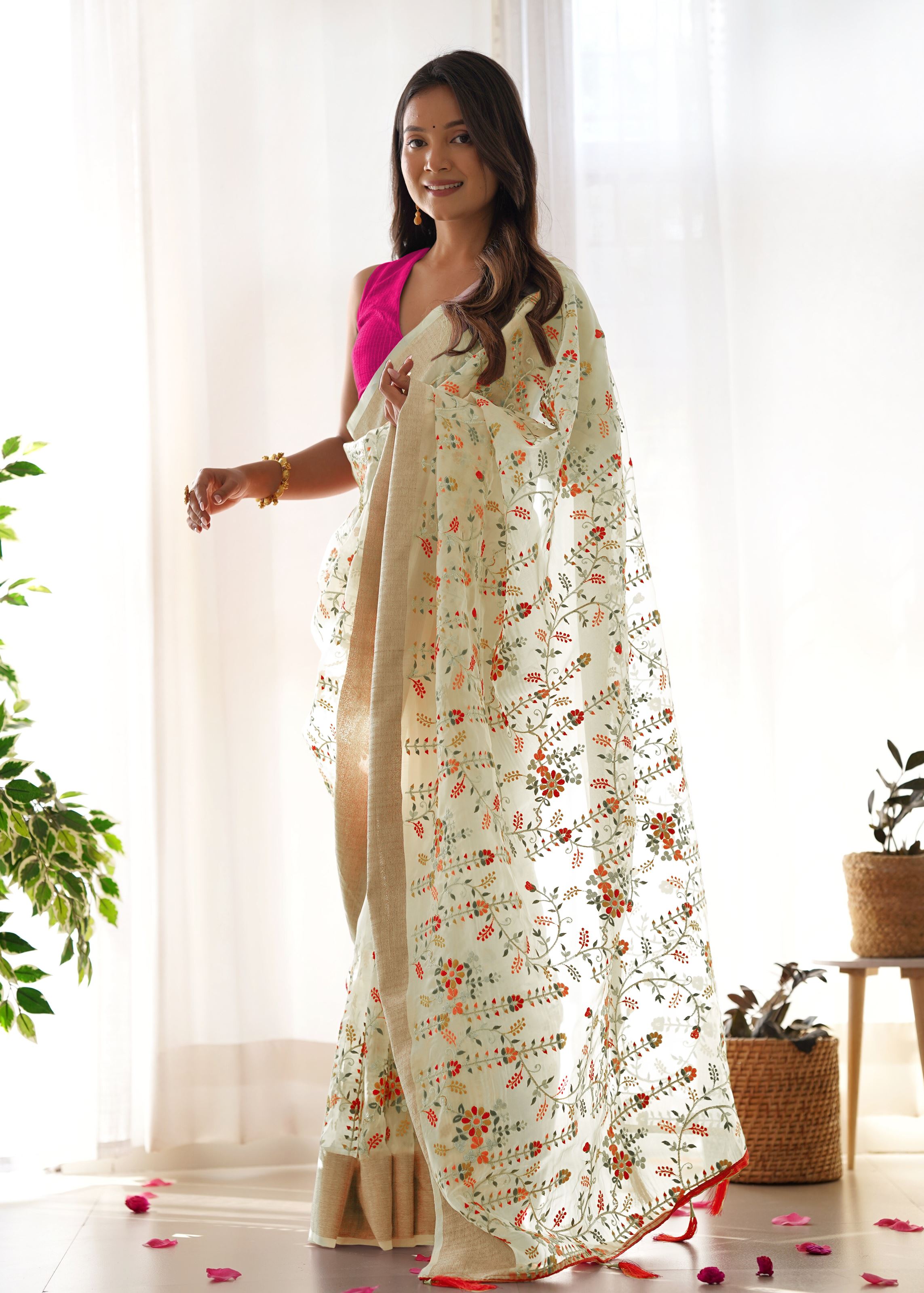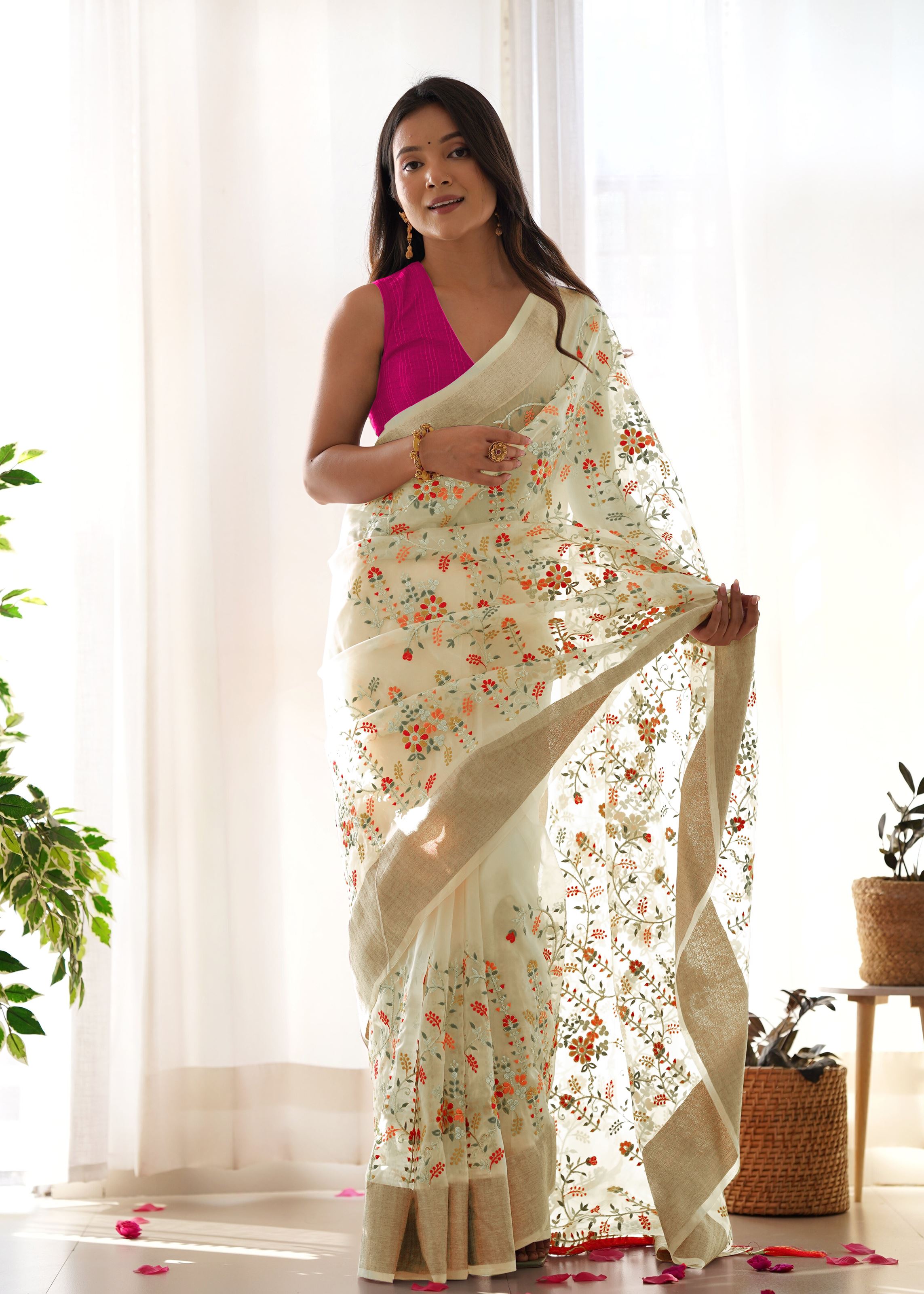 Paired with a contrasting pink art silk blouse, the combination enhances the vibrancy of the ensemble, giving it a stylish designer appeal. The subtle sheen of art silk complements the delicate embroidery, creating a balanced look of luxury and comfort. Whether you accessorize with gold jewelry for a royal festive feel or keep it minimal for a chic contemporary vibe, this saree adapts to every occasion effortlessly.