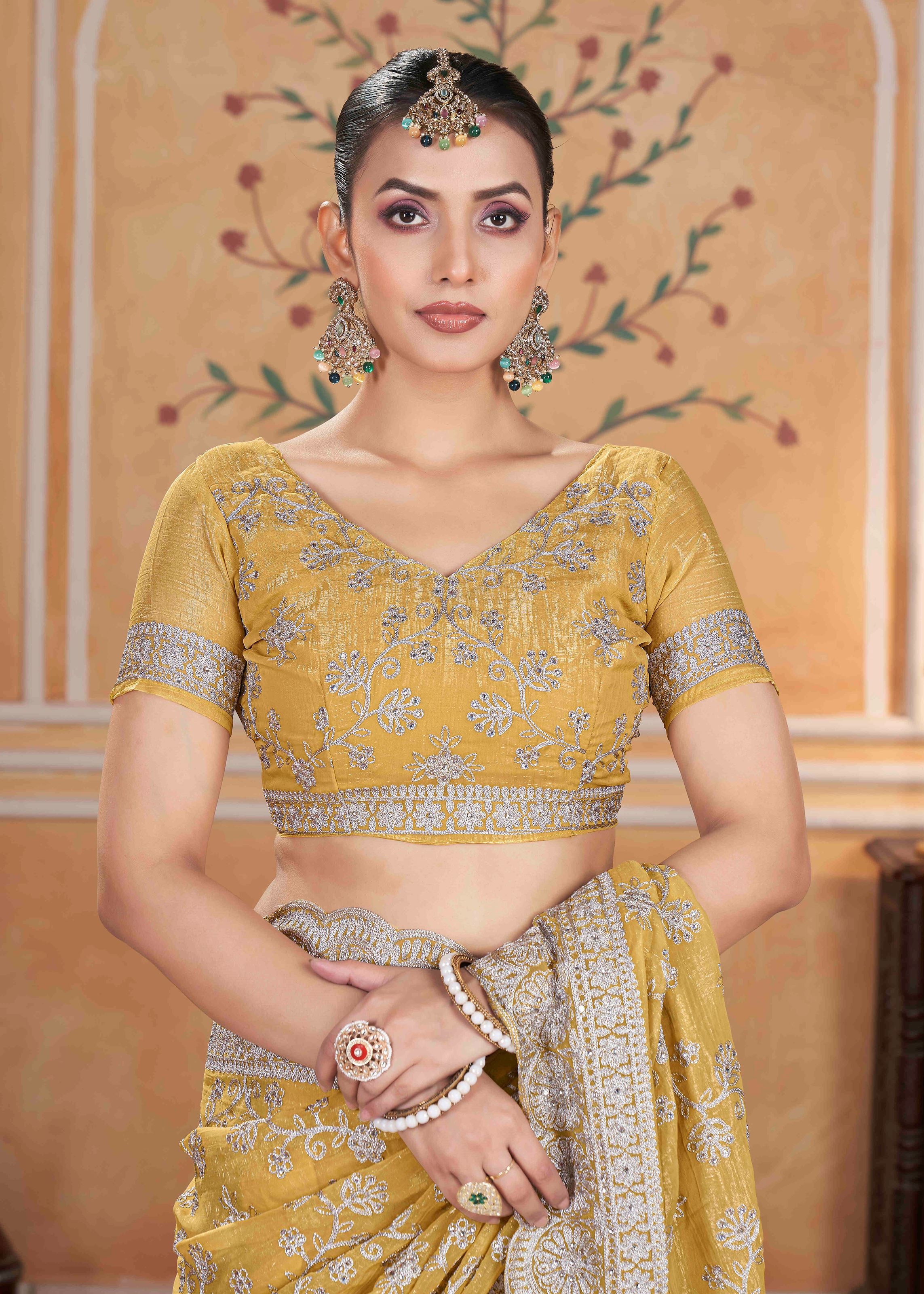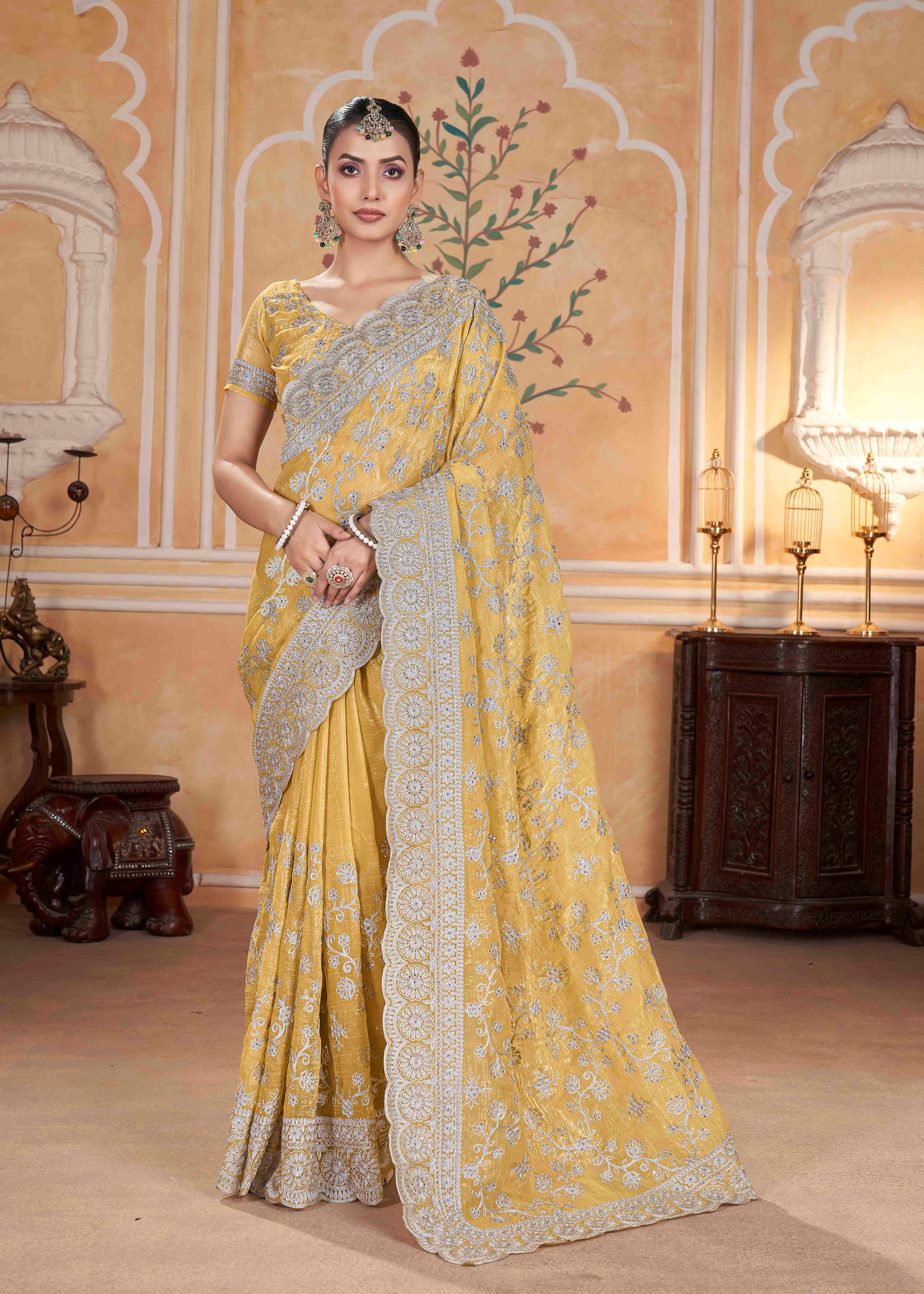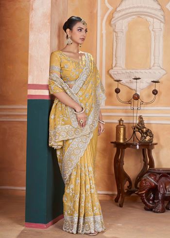 The saree is paired with a matching yellow chiffon blouse that complements the saree perfectly for a coordinated and refined look. Its intricate craftsmanship and luxurious design make this saree a timeless addition to your wardrobe. Perfect for traditional events and heavy partywear occasions, this saree combines elegance with contemporary styling.
