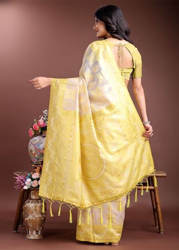 The vibrant yellow shade radiates warmth, joy, and positivity—making it especially fitting for festive gatherings and auspicious celebrations. The saree is adorned with intricate jacquard weaving, adding a refined texture and elevating its overall appeal. This subtle artistry brings out the richness of traditional craftsmanship while keeping the look graceful and understated.