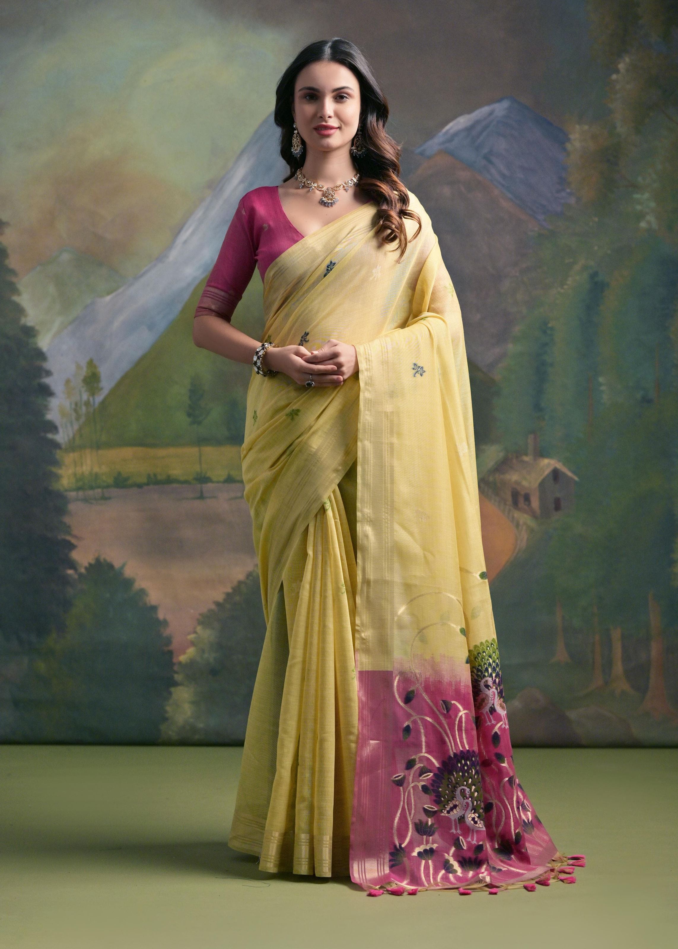 Infuse your festive style with vibrant charm through this Yellow Muga Cotton Saree with Peacock Pallu and Butti Weaves. Crafted from premium Muga cotton, the saree offers a rich yet lightweight drape, ideal for all-day comfort and grace.