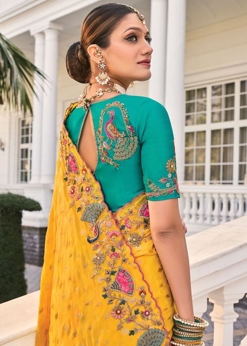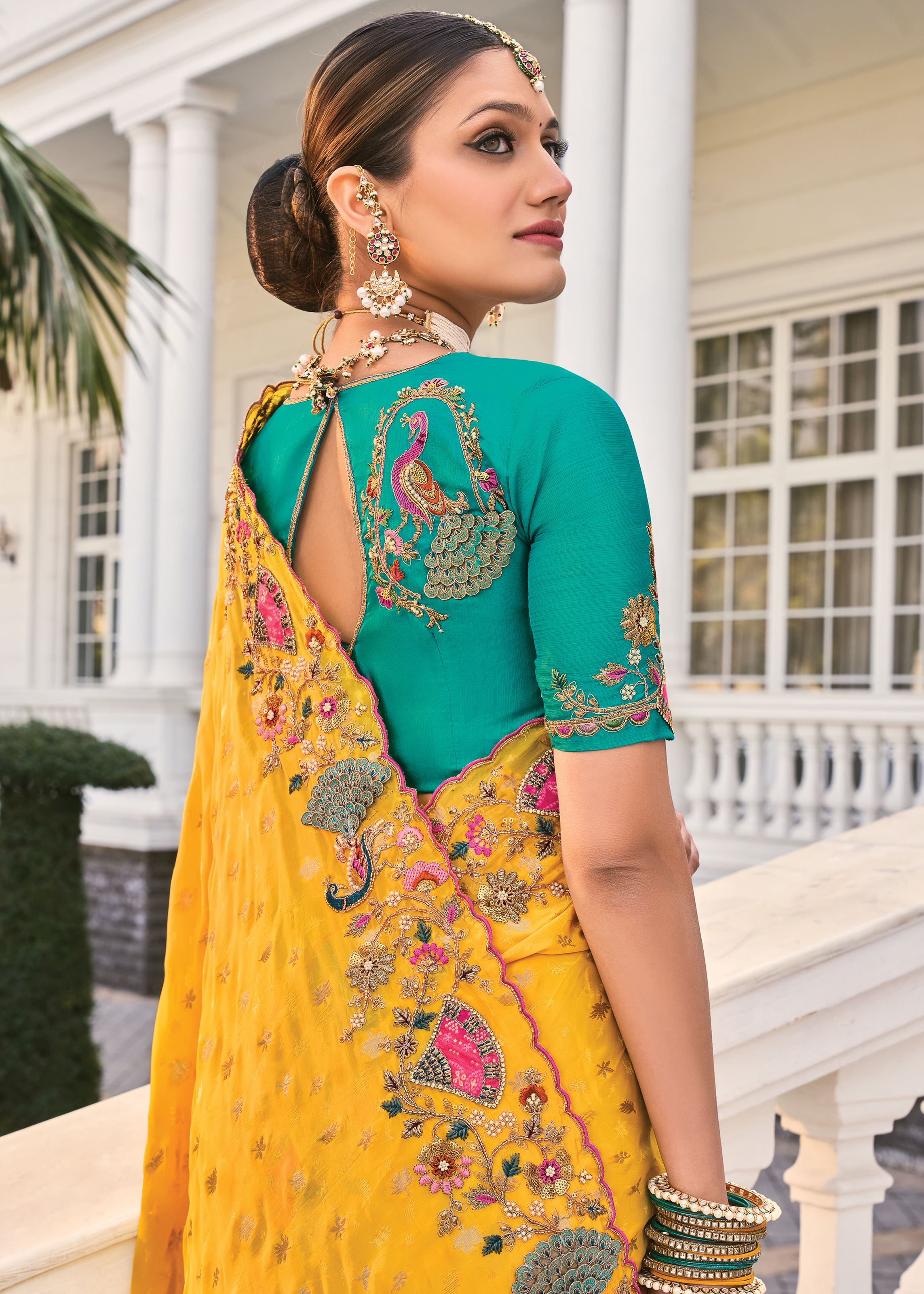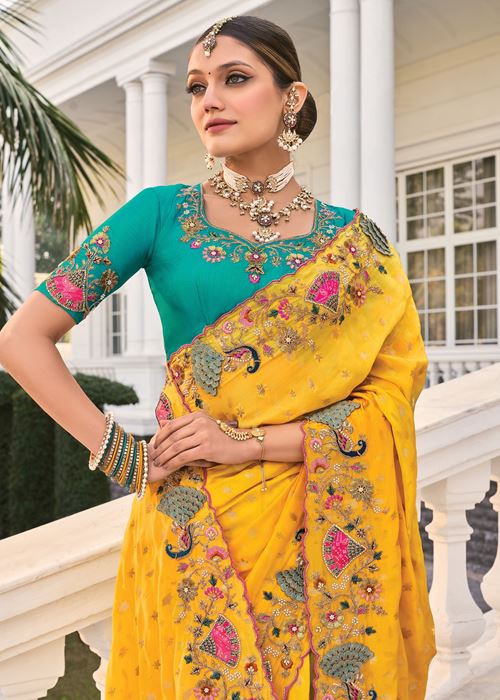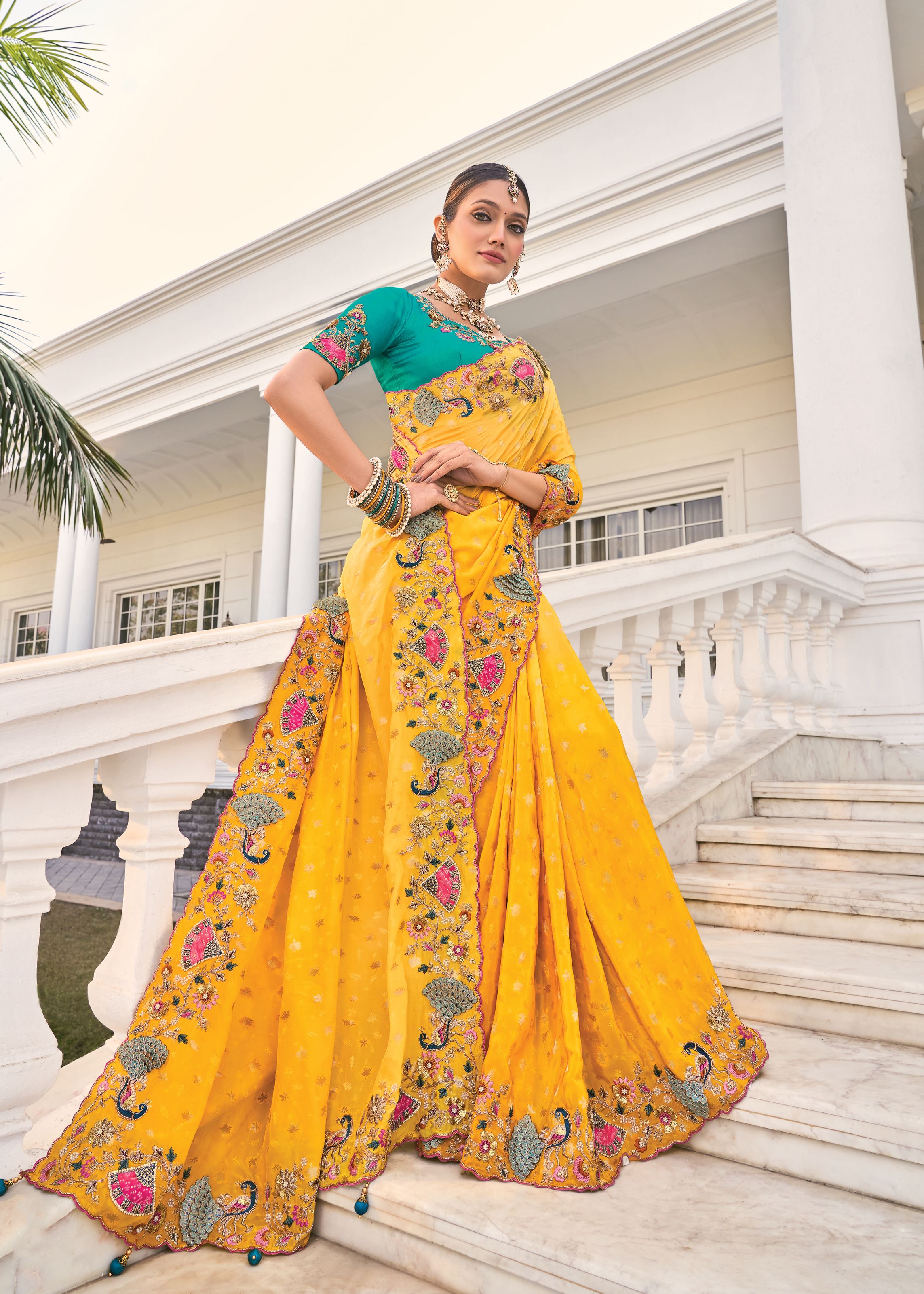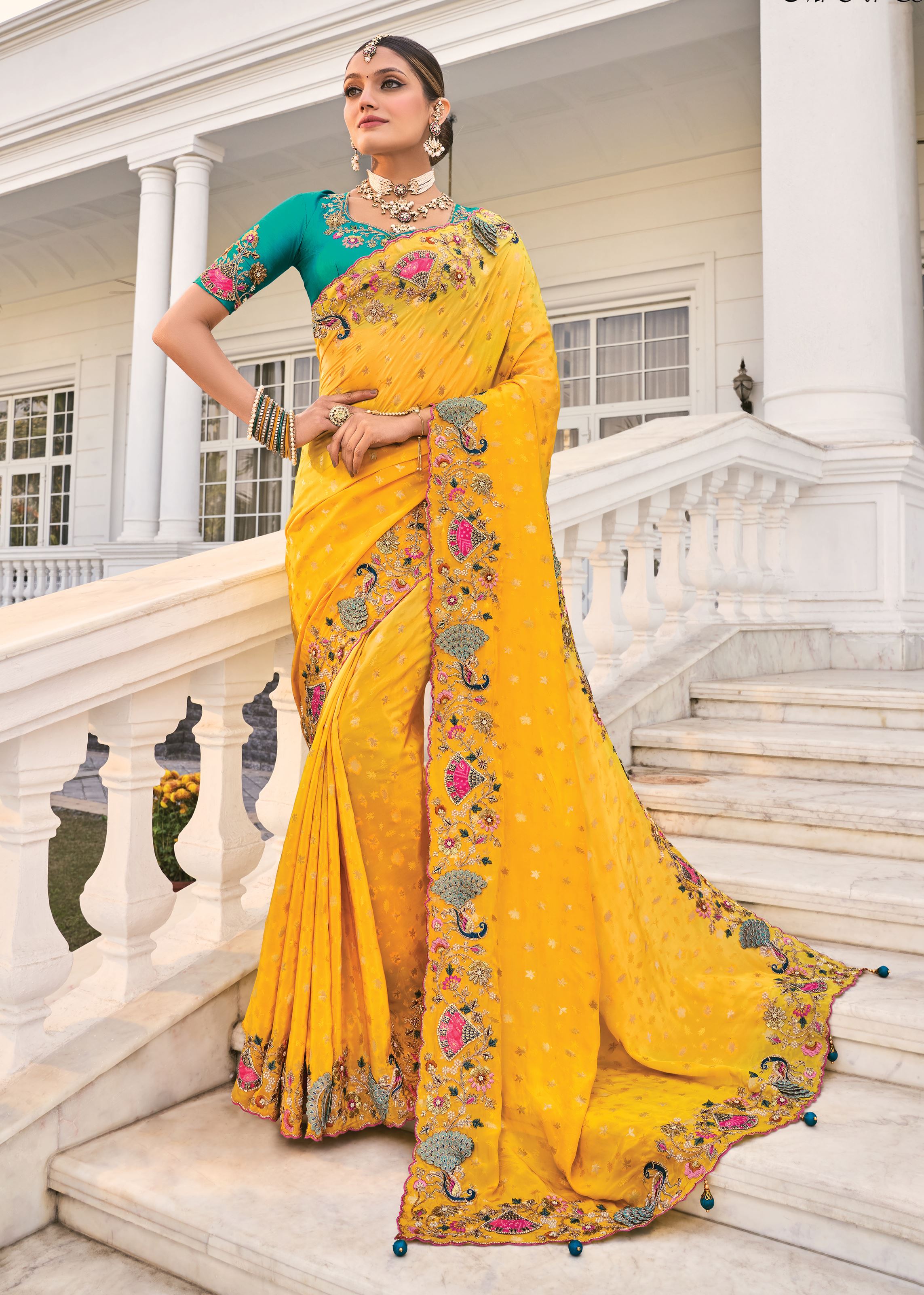 Yellow Natural Crepe Saree With Moti, Cut-Dana With 3D Heavy Work