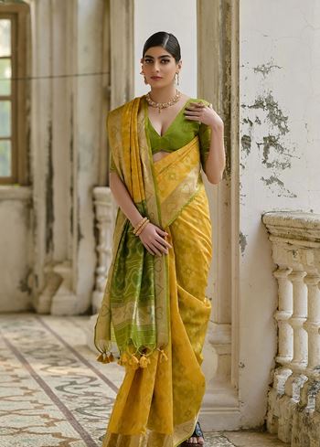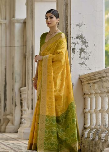 The cheerful yellow hue symbolizes joy and prosperity, making it a perfect pick for festive celebrations, haldi ceremonies, and day-time functions. The intricate Ikkat patterns lend an artisanal touch to the saree, while the striking mahendi green contrast pallu adds depth and a bold statement to the ensemble.