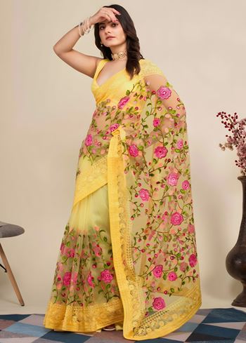 Yellow Soft Net Saree with C-Pallu Chikankari Embroidery Work