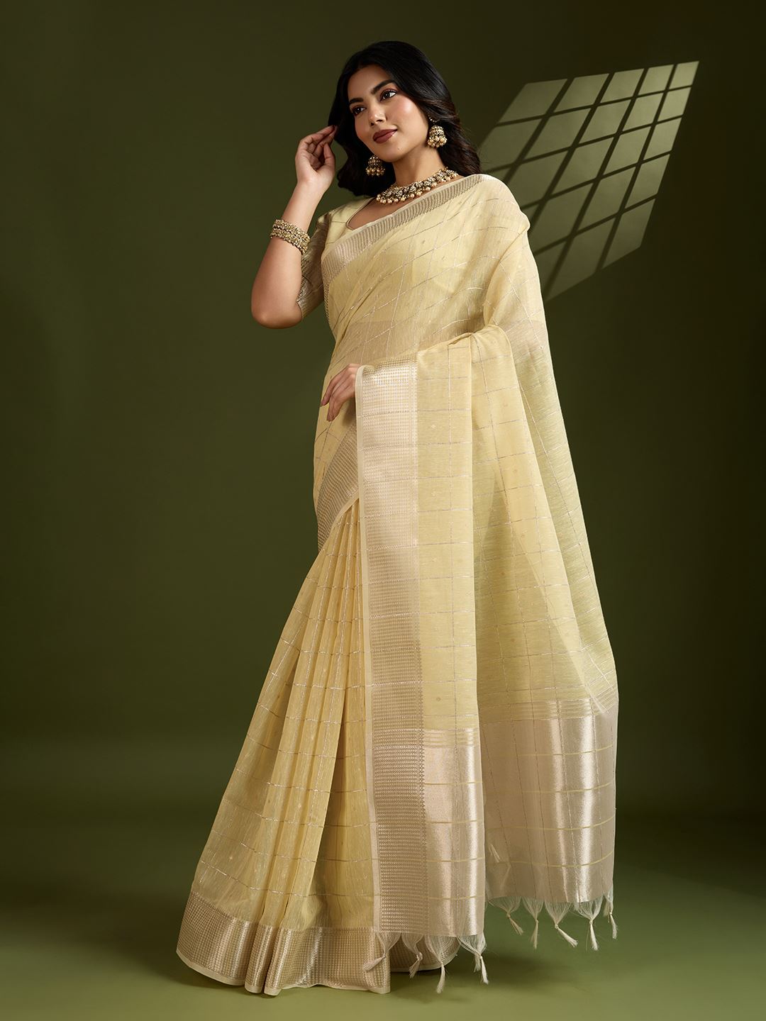 Radiate festive charm with this Yellow Soft Silk Saree with Checks and Zari Pallu from Aethnofit Fashions. Woven from high-quality soft silk, the saree features a vibrant yellow hue that’s beautifully balanced with intricate check patterns, lending a structured elegance to the drape. The shimmering zari pallu adds a touch of richness, while the matching yellow blouse in soft silk completes the ensemble with seamless grace.