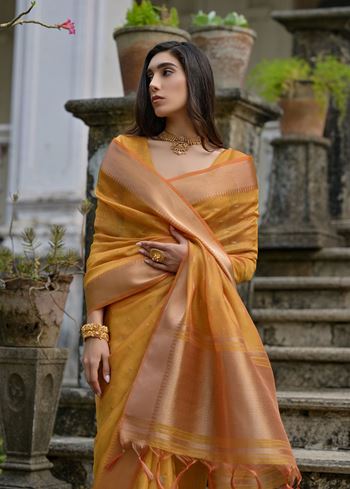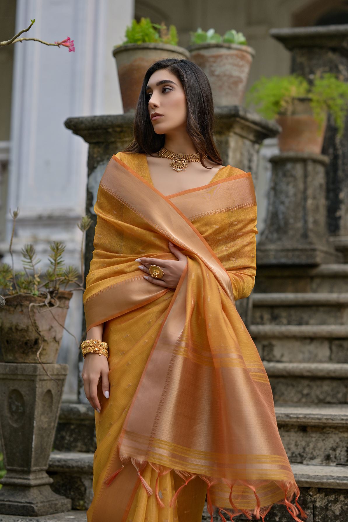 The vibrant sunny yellow hue exudes warmth and positivity, making it an excellent choice for festive occasions, daytime functions, or celebrations that call for a cheerful and elegant look. The saree is embellished with subtle butti work throughout, creating a refined visual texture that draws the eye without overpowering. Complementing the minimalistic body, the zari pallu features intricate gold threadwork, adding a regal touch that elevates the overall aesthetic.